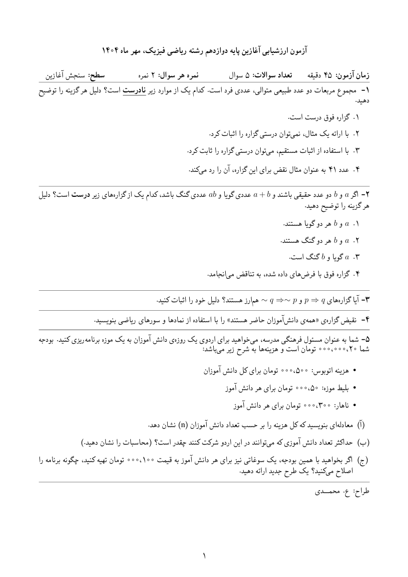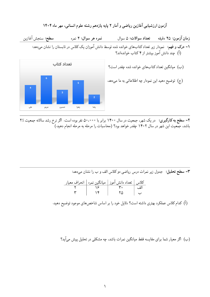 ریاضی و آمار 1 انسانی، خرداد 1404